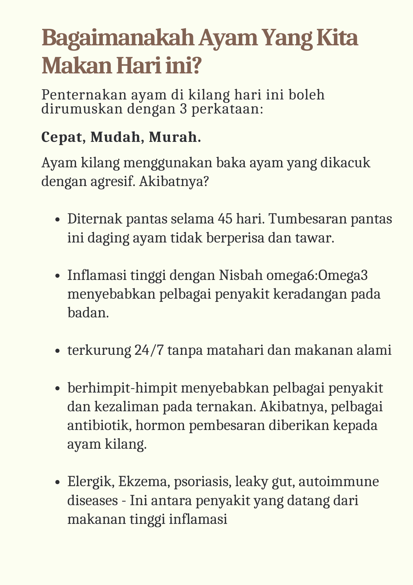 2- Diet Pemakanan. Walaupun ayam kilang Free range diberikan pintu untuk ayam keluar, ayam masih tidak berganjak dan memilih untuk makan dedak komersial yang disediakan. Di ALL, dedak komersial hanya diberikan tak lebih 10% daripada diet mereka pada ham 5-6 petang. selebihnya makanan alami.